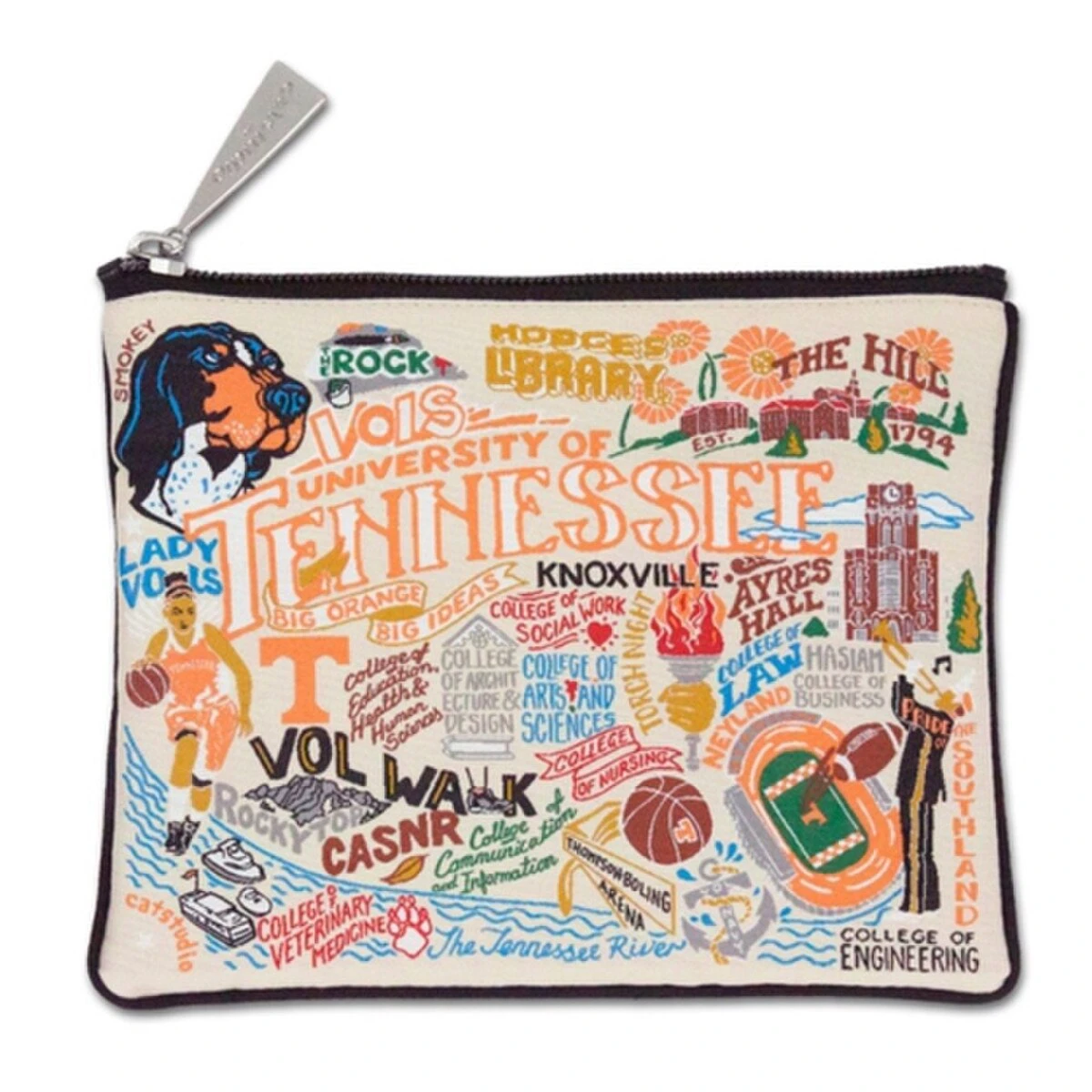This original design celebrates the University of Tennessee. Go Vols! The design is colorfully woven into a handy-sized zip pouch – perfect for toting your keys, valuables, art supplies, cosmetics, and more! Complete with our signature collegiate-inspired black lining. 100% Polyester. Spot Clean. 7″ x 5.5″. Made in Thailand.