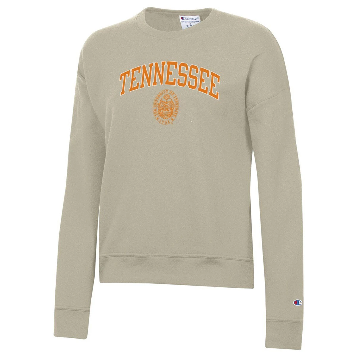 Champion’s new women’s fleece crew is a classic and sports a classic University of Tennessee Seal graphic. Relaxed fit with ribbed cuffs and waistband. Â 50% cotton/ 50% polyester